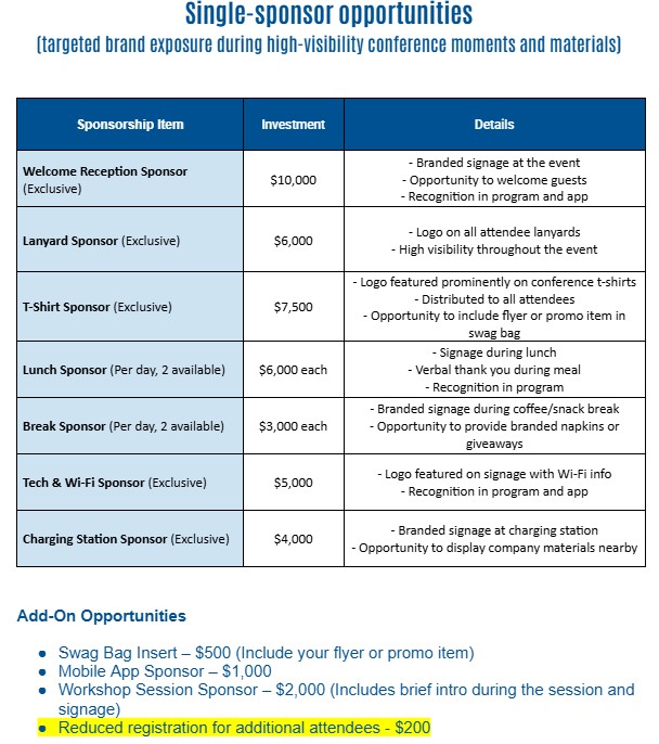 Some of the sponsorship options include an Exhibitor Table: Presenting, Visionary, Champion, Community Sponsor, and Friend of the Conference.