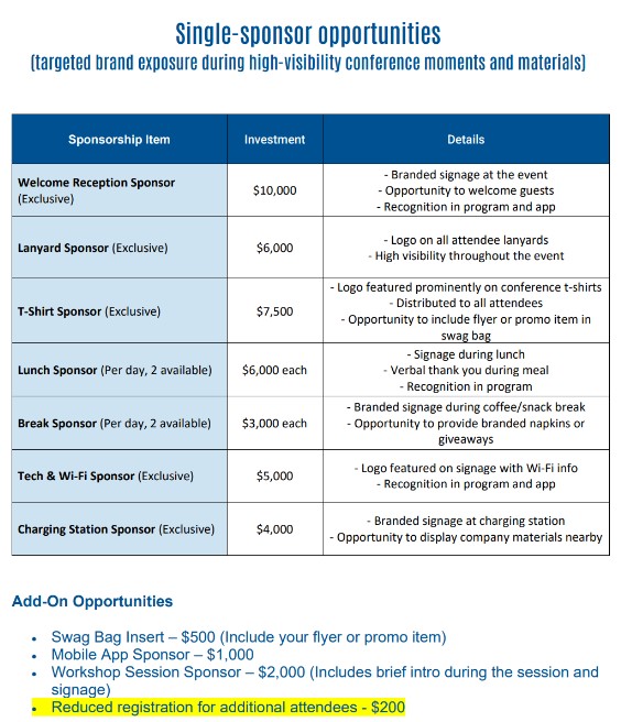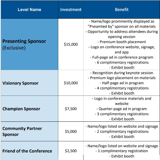 Some of the sponsorship options include an Exhibitor Table: Presenting, Visionary, Champion, Community Sponsor, and Friend of the Conference.
